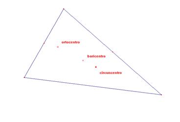 | Teorema de la recta de Euler. En cualquier triángulo, el circuncentro, el baricentro y el ortocentro son colineales y la distancia del baricentro al ortocentro es doble de la distancia del baricentro al circuncentro |