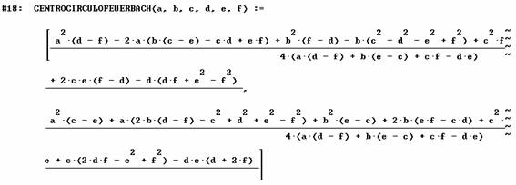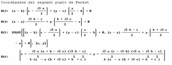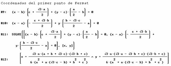 Se calculan entonces circuncentro y el centro del circulo de Feuerbach para nuestro triángulo original, y se introducen sus coordenadas junto a las del primer punto de Fermat para hallar la ecuación de la circunferencia que pasa por esos tres puntos