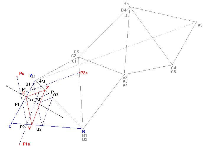 Observamos ahora que P'P2P3 y Q'Q2Q3 son homotéticos; entonces X estará en la intersección de P'Q' con AC. Y con las paralelas correspondientes obtenemos XYZ.