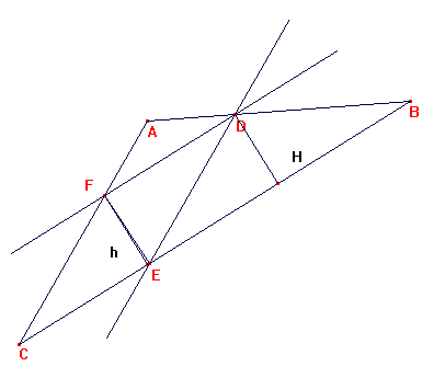 Ambos triángulos tienen la misma altura, por ser la distancia entre dos rectas paralelas (H = h).