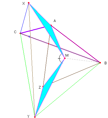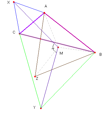 Colorario 3.- Supongamos que se construyen triángulos equiláteros sobre los lados de un triángulo arbitrario, dos hacia el exterior y uno hacia el interior. Sea M el centro del triángulo equilátero interior, y X e Y los vértices exteriores de los otros dos. Entonces XMY es un triángulo isósceles, con un ángulo de 120º en el vértice M