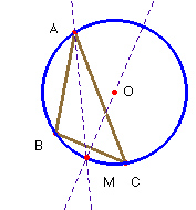 Solución.- La bisectriz del ángulo A nos proporciona dos ángulos iguales: el BAM y el MAC, por tanto también son iguales los arcos BM y MC. De ahí que los segmentos correspondientes, esto es, la distancia de M a B y la distancia de M a C sean iguales. Eso es igual que decir que M está en la bisectriz OM del lado AB.