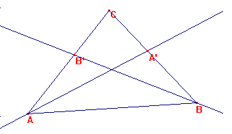 | Teorema de Ceva. Sean a, b c, los vértices de un triángulo y tres puntos a' de bc, b' de ca, y c' de ab sobre los lados de este triángulo. Entonces las tres rectas aa', bb', y cc' son concurrentes si y sólo si se tiene: a'b / a'c b'c / b'a c'a/ c'b = - 1 |