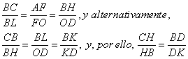 Por ello, Pero Luego los ángulos COB y AOF juntos son iguales a los AOC y BOF, siendo la suma de los 4 ángulos 4R. Por tanto, de [1] y [2], se tiene que Luego los triángulos rectángulos AOF y CLB son semejantes. Considerando que BKL y KDO también son semejantes, tenemos que : De aquí, se tiene que: Así pues, (D