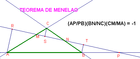 Consideremos las proyecciones (R, S y T) de los vértices del triángulo sobre la recta determinada por los puntos M, N y P. Los triángulos AMR y MCS, por un lado, los NCS y NBT por otro, y los APR y BPT por otro, son semejantes. De las semejanzas indicadas se deduce: AR/BT = AP/BP y BT/CS = BN/CN y CS/AR = CM/MA. Multiplicando miembro a miembro las tres igualdades obtenemos 1 = (AP/PB)(BN/CN)(CM/MA). Reescribimos el segundo miembro de la igualdad del siguiente modo: (AP/PB)(BN/NC)(CM/MA) y, teniendo en cuenta que la recta tiene que cortar al triángulo en uno o en tres puntos exterioriores a sus lados, resulta que la igualdad anterior toma el valor 1 pero con signo negativo si consideramos los segmentos con orientación.