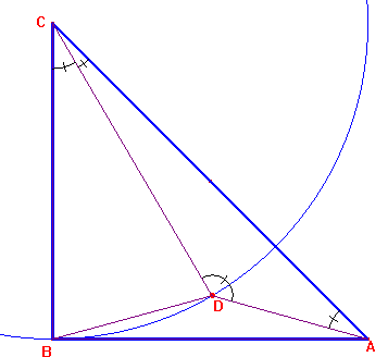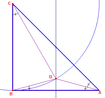 α va de ser de 30º y que, por tanto, el triángulo BDA es isósceles, situamos D sobre la mediatriz de BA. Entonces se comprueba que α vale 30º)Partimos de un triángulo rectángulo isósceles ABC. Puesto que el punto D ha de cumplir CD=CB, se ha de encontrar sobre el arco de circunferencia de centro C y radio CB.