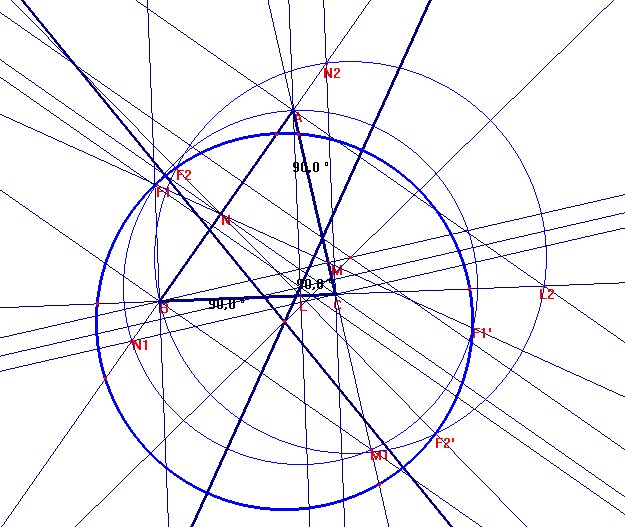 Los círculos del haz j1 cortan a los lados CA, AB en pares de puntos de I2, I3 (ya que I2(M)=µ, I2(A)=N, I3(N)= µ, I3(A)=N1), y los círculos de j2 cortan AB, BC en pares de puntos de I3 I1. El círculo W que pasa por F1, F'1, F2 pasará también por F'2 ya que W corta AB según un par de I3. Luego W es solución del problema.