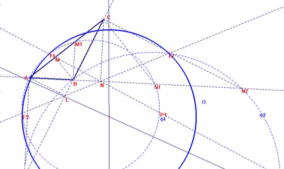 Sean M1 sobre CA tal que ABM1 =90º. N1, N2 sobre B tales que ACN1=BCN2 =90º, y L2 sobre BC tal que BAL2 =90º.