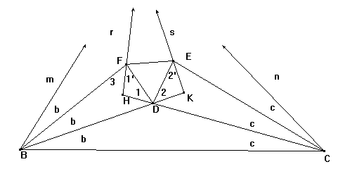 D equidista de BF y de CE,DF=DE, y el triángulo DEF es equilátero. Ángulo 1=(60º+c)-(b+c)=60º-b. De manera similar,ángulo 2=60º-c. Por F tracemos la recta r de manera que ángulo 1' =ángulo 1. Por E tracemos la recta s de manera que ángulo 2' =ángulo 2. Ángulo 3=(60º+a)-(60º-b)=a+b. Ángulo mr=(a+b)-b=a. De manera similar,ángulo sn=(a+c)-c=a. Y ángulo mn=180º-3b-3c=3a. |