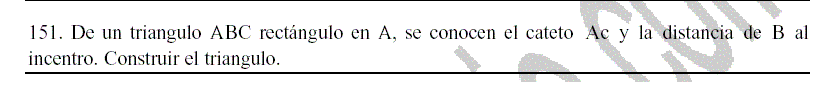 151. De un triángulo ABC rectángulo en A se conocen el cateto AC y la distancia de B al incentro.