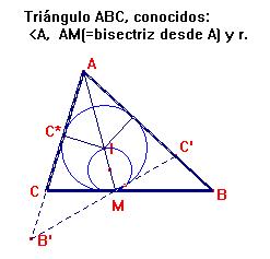 El ángulo <A, p-a, ra y la longitud de la bisectriz va. Esta construcción se realiza sin dificultad, una vez que, fijada la posición del punto M, tracemos las tangentes a la circunferencia inscrita.
