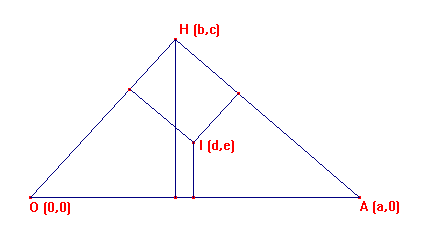 La circunferencia inscrita ha de ser tangente a los 3 lados del triángulo, por lo que en los puntos de intersección los radios han de ser perpendiculares a los lados, lo que indica que para la figura dada la longitud del radio es el valor absoluto de e. Así, una primera condición sobre (d,e) supuesto el incentro se obtiene escribiendo la ecuación de la circunferencia de centro (d,e) y radio e.