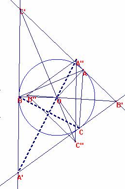 Sea ABC un triángulo no equilátero. Sea T su circunferencia circunscrita y O su centro. Las tangentes en A, B , C a la misma forman un triángulo A' B' C'. Sea A'' B'' C'' el homotético de A'B'C' de centro O y razón -1/2.