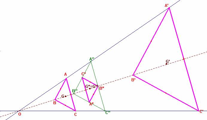 Una vez dados los dos triángulos homotéticos en posición de Thales, resulta que los puntos A*, B* y C* del enunciado no son otros que los puntos medios de los segmentos que son medias armónicas de las bases de los trapecios formados por los lados homólogos paralelos. Por tanto el triángulo A*B*C* es el triángulo medial del triángulo formado A''B''C''. Como quiera que este último es homotético a los dos primeros, su medial también lo será por tanto. Además como el baricentro de un triángulo y el de su medial es el mismo entonces los centros de gravedad de los triángulos ABC, A'B'C' y A*B*C* son colineales.