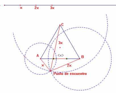 2. El punto O, intersección de los segmentos AD y BE, es el Punto de encuentro. Es decir, AO = 2 BO = 3 CO. Compruébalo con Cabri.