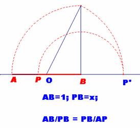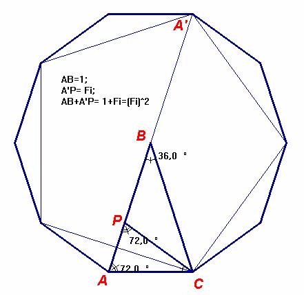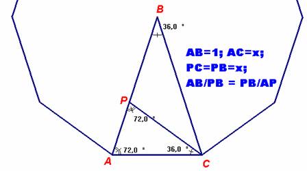 La construcción se basaba en la división del segmento unidad en media y extrema razón. P divide AB en media y extrema razón si el segmento mayor, x, es la media proporcional entre la longitud entera del segmento y la longitud del segmento menor; esto es, 1/x = x/(1-x) o lo que es equivalente: x2 + x -1 = 0.