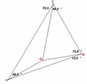 Se tiene ABC con D interior de manera que < ACD=20º, < DCB=40º, < CBD=70º, < DBA =10º.