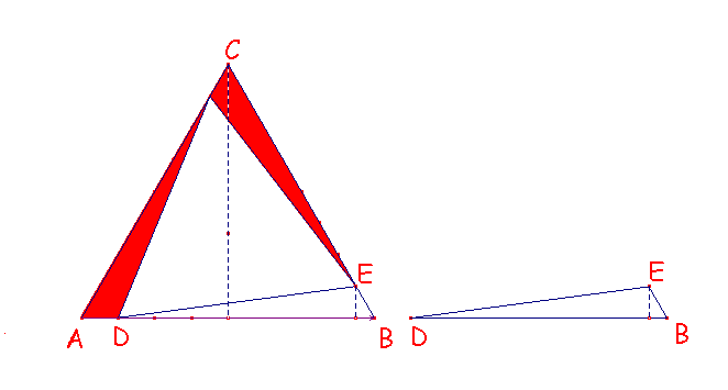 Por la simetría central de orden 3 que tiene la construcción, observamos que cuanto mayor sean los triángulos sombreados de rojo menor será el área del inscrito. El valor máximo se alcanzará justo cuando lo sea la expresión algebraica que calcula el área de uno de esos triángulos.