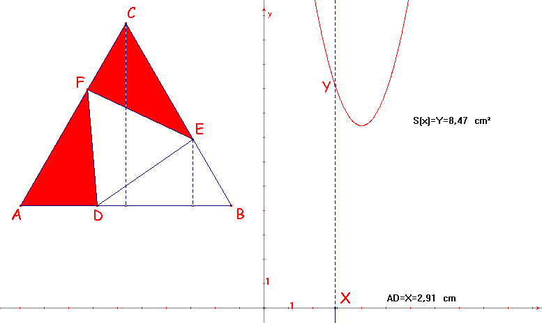 Calcular el área del inscrito en los casos en que el vértice del inscrito disten del dado en 1 cm, 2 cm, ... 7 cm. ¿Cómo varía esta área?, ¿Cuál es el triángulo inscrito de área mínima?. Trazar el gráfico.