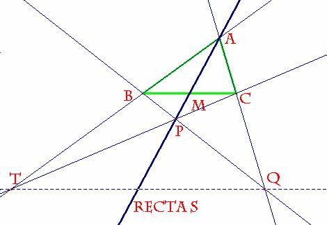 rectas BP, y CP, que cortarán a AC y a AB, o sus prolongaciones, en Q y T. Demostrar que TQ es paralela a BC.