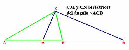 Dado un triángulo ABC, si trazamos las bisectrices del ángulo en C y determinamos sobre el lado AB los puntos M y N, pies de las bisectrices anteriores, entonces se tiene que los puntos A,M,B y N forman una cuaterna armónica.