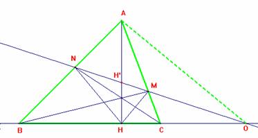 Los puntos B, H, C y O (ver figura 2) forman una cuaterna armónica. Los puntos N, H', M y O también forman una cuaterna armónica siendo los rayos HH' y HO perpendiculares entre sí. Por tanto esos dos rayos son las bisectrices de los rayos HN y HM.