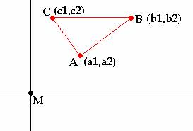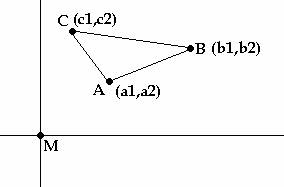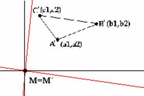 | Sea ABC un triángulo en el plano afín euclideo P. Sea M un punto cualquiera del plano. Suponemos que: - la perpendicular por M a la recta AM corta a la recta BC en A' - la perpendicular por M a la recta BM corta a la recta CA en B' - la perpendicular por M a la recta CM corta a la recta AB en C' Demostrar que los puntos A', B' C' están alineados. |