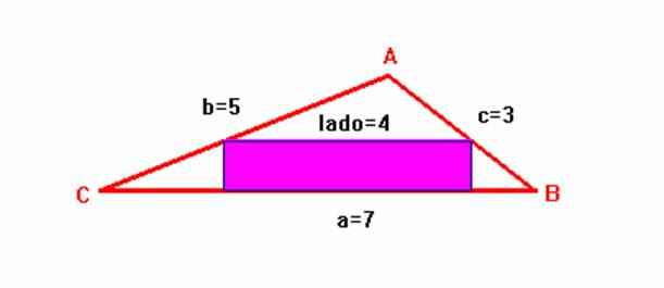 Dado un triángulo de lados 7 cm, 5 cm, y 3 cm, inscribir un rectángulo de base 4 cm.
