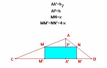Nota. No existen más soluciones que ésta ya que en los demás casos si queremos que el lado del rectángulo inscrito sea paralelo a alguno de los lados b y c, por el hecho de ser el ángulo A obtuso (=120º), al trazar la perpendicular desde un punto del lado AB(AC) hasta el lado AC (AB) corta en la prolongación del lado respectivo.