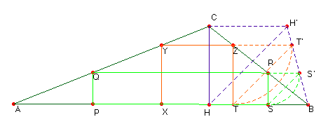 De todos los rectángulos inscritos el de mayor altura, caso extremo, es aquel rectángulo impropio cuya base es cero (se ha reducido a la altura CH del triángulo, el de menor altura se reduce al segmento AB).
