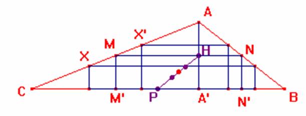 Consideramos en primer lugar el triángulo formado por los puntos medios de los lados AB y AC. Sea así pues el rectángulo NN'M'M que lo vamos a llamar "rectángulo medianero". Para cualquier otro rectángulo inscrito en nuestro triángulo determinamos su "simétrico" respecto de los puntos del rectángulo medianero situados en los mismos lados. Así obtenemos rectángulos de igual área. De esta manera también los puntos medios de ambos rectángulos serán simétricos respecto del punto medio del rectángulo medianero. Como los rectángulos límite de los inscritos en el triángulo son por un lado el formado por la altura AA' (base igual a 0) y, por otro, el formado por la base BC (altura igual a 0) entonces sus respectivos puntos medios H y P determinarán los extremos del segmento.