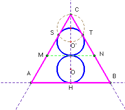 Solución.- Trazando la tangente común MN a los círculos, el de centro O’ queda inscrito en el triángulo equilátero CMN. Su centro es el baricentro y el ortocentro, así pues el diámetro del mismo es 2/3 de su altura. De este modo resulta que la altura del triángulo ABC que contiene a los dos círculos, es igual a 5 veces el radio de éstos.