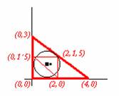 El nuevo triángulo DEF que aparece no es muy difícil probar que es semejante al anterior (rectángulo y las medidas de sus lados son proporcionales según la razón de proporcionalidad ½; luego su radio también lo será. Como su radio vale entonces ½, trazando paralelas a sus dos catetos a una distancia de ½, también nos dará el incentro, en el punto (2-1/2, 1´5-1/2) que el lo mismo que (1´5,1). Si la distancia de ese incentro al otro fuera igual al radio de la circunferencia inscrita mayor, entonces estaría contenido en la circunferencia, como se pide que se demuestre, pero al calcular la distancia vemos que esto no se cumple, sino que la distancia de un incentro a otro es 0,5, es decir el radio de la circunferencia inscrita a DEF. Luego el incentro de ABC está contenido en la circunferencia inscrita de DEF, pero no al contrario como se pedía que se demostrara.