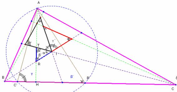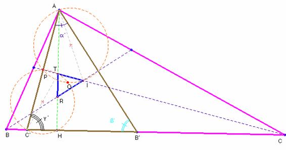 En el triángulo isósceles CAC’, la bisectriz CI del ángulo en C, es la mediatriz del segmento AC’. Por lo mismo la bisectriz BI resulta ser la mediatriz de AB’. Como, por otra parte, el lado TR está sobre la altura AH, tenemos que el triángulo IRT tiene sus lados perpendiculares a los del triángulo AC’B’; por tanto sus ángulos son iguales y son semejantes. Para calcular los ángulos nos fijamos en el triángulo isósceles CAC’. Áng.(ACC’)=(180-g)/2 =90-g/2=g’. En el BB’A, áng.(BB’A)=(180-b)/2=90-b/2=b’; finalmente, áng.(C’AB’)= 180-(b‘- g‘) = 90- a/2 = a’. (Hemos denominado por a, b y g a los ángulos del triángulo ABC).La correspondencia de puntos homólogos es: A à I; Bà’ R y Cà’ T y la de ángulos áng.(RIT) = a’; áng.( TRI) = b’; áng.(RTI) = g’; se han marcado en la figura con uno, dos y tres arcos respectivamente.