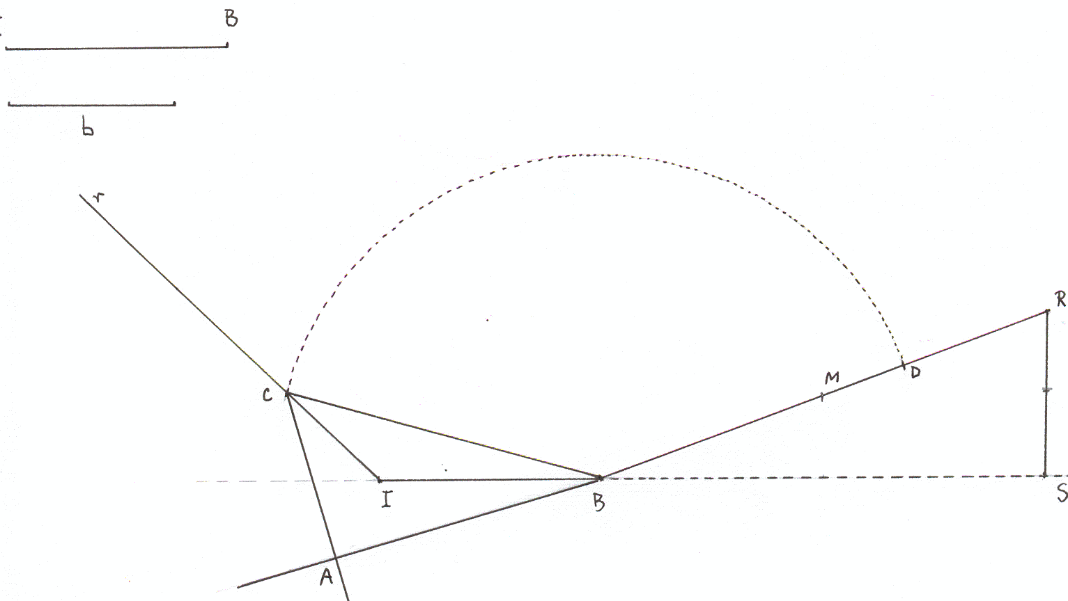 Como IB es una bisectriz, el vértice C está situado en la semirrecta r que forma con IB un ángulo de 135º. Sobre la prolongación de IB (más allá de B), tomamos un segmento de longitud 2d, de extremo S. Levantamos la perpendicular a IB, SR, con SR = b.