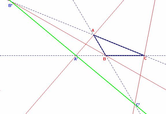 Aplicando el Teorema de Menelao en su forma recíproca los puntos A', B' y C' estarían alineados.