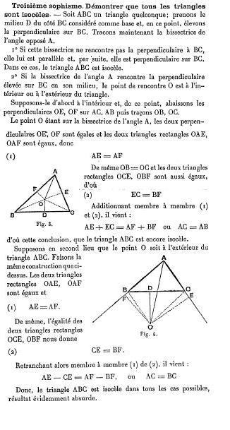 Sofisma tercero; demostrar que todos los triángulos son isósceles. Sea ABC un triángulo cualquiera. Tomemos el punto medio D del lado BC considerándolo como base, y tomemos por D la perpendicular a BC: Tracemos ahora la bisectriz del ángulo opuesto A. 1º.- Si esta bisectriz no se encuentra a la perpendicular a BC por D, siendo por tanto paralela a ella y, por consiguiente, es perpendicular a BC, en ese caso el triángulo ABC es isósceles. 2º.- Si la bisectriz del ángulo se encuentra con la perpendicular a BC por D, el punto de encuentro O está en el interior o en el exterior del triángulo. Supongamos en primer lugar que está en el interior, desde este punto O, tracemos las perpendiculares OE, y OF sobre AC y BC, y después tracemos OB y OC. El punto O está en la bisectriz del ángulo A, por lo que las dos perpendiculares OE y OF sin iguales y los dos triángulos rectángulos OAE y OAF son iguales, por lo tanto (I) AE=AF. De igual manera OB=OC, y los dos triángulos rectángulos OCE y PBF son también iguales, de donde: (II) EC=BF. Sumando miembro a miembro (I) y (II), tenemos: AE+EC=AF+BF de donde AC=Ab, de donde se tiene la conclusión de que el triángulo ABC es isósceles. Supongamos en segundo lugar que el punto O esté en el exterior del triángulo ABC.Hagamos la misma construcción: Los dos triángulos rectángulos OAE, OAF son iguales y (1) AE=AF. Del mismo modo, la igualdad de los dos triángulos rectángulos OCE, OBF nos da (2) CE=BF. Restando miembro a miembro (1) de (2), queda: AE-Ce=AF-BF, de donde AC=BC. Así pues, el triángulo ABC es isósceles en todos los casos posibles, resultado evidentemente absurdo. |