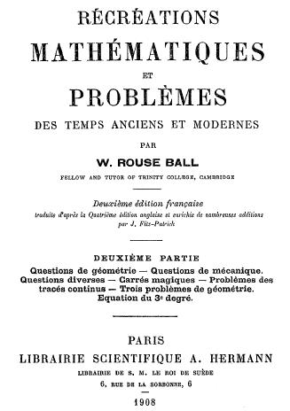 Ball, W.R. (1908): Recreaciones Matemáticas y problemas de los tiempos antiguos y modernos. Segunda edición francesa , tratada después de la cuarta inglesa con numerosas adiciones. Librairie Scientifique A. Hermann. París (p. 5)