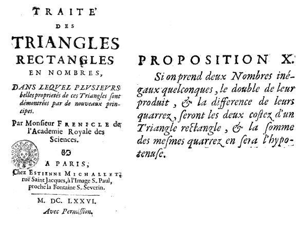 Frenicle (1676): Tratado de los triángulos rectángulos en números,