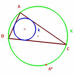 Se tienen dos circunferencias una k dentro de otra K. Supongamos que desde un punto A de K (la exterior) sucede lo siguiente: Trazamos por A una tangente a k que vuelve a cortar a K en B; por B trazamos la otra tangente a k, que vuelve a cortar a K en C; por C trazamos la otra tangente a k, que resulta que vuelve a cortar a K en A (es decir, se cierra la sucesión de tres tangentes). Entonces eso mismo pasa (es decir el triángulo también se cierra) cuando hacemos la misma operación partiendo de cualquier otro punto A* de K.
