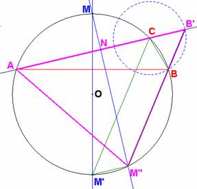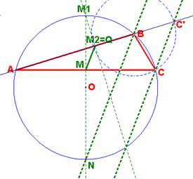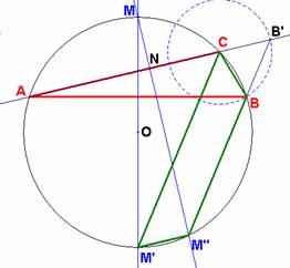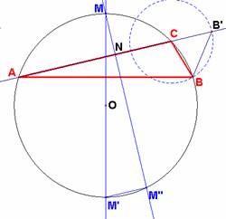 Al prolongar los segmentos MO y MN, determinamos en la circunferencia los puntos M' y M'', respectivamente. Así se verifica la igualdad entre los ángulos inscritos en la misma circunferencia <M'MM'' y <A, por estar formados por pares de lados perpendiculares entre sí. De esta manera se dará la igualdad entre las cuerdas M'M'' y BC. Si ahora prolongamos el lado AC y sobre esta recta determinamos el punto B' de modo que CB' = CB, entonces en el triángulo isósceles CB'B, se tiene que el ángulo B' es igual a C/2. Si trazamos la bisectriz del ángulo C en el triángulo ABC, dicha bisectriz cortará a la circunferencia en M'. Por otro lado, el ángulo inscrito M''MA es igual a C/2. Así, de este modo, los puntos B', B y M'' han de estar alineados ya que el ángulo exterior en B del triángulo ABB' deberá ser igual a C/2 + A. Luego si prolongamos el lado B'B obtenemos la figura inscrita en la circunferencia BM''M'C que no es otra que un trapecio isósceles. Por tanto, los ángulos en la base son iguales y así, el ángulo inscrito CM'M'' = C/2 es igual también al ángulo inscrito CAM''. Hemos probado así que el triángulo AB'M'', es isósceles con ángulos iguales en A y B' y así tenemos que el segmento NM'' es la mediatriz del mismo. En definitiva, el punto N es el punto medio del lado AB', y así, AN = NB'. Como NB' = NC + CB' = NC + CB, entonces: AN = NC + CB . |