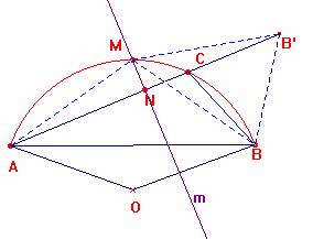 .- a) El punto N buscado, por cumplir que AN = NC + CB es tal que AN + (NC+CB) = 2 AN = b + a, es decir, AN = ½(b+a); el punto N puede obtenerse llevando a continuación de C el segmento CB y tomando el punto medio del segmento resultante. Trazando la mediatriz m de AB’ hallamos el punto N y el punto M, corte de la mediatriz con el arco AB que subtiende el triángulo.