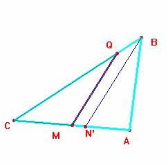 c) Tracemos por B un segmento paralelo a QM, sea éste BN’. Queremos probar que N’ = N, esto es, que BN’ es la bisectriz y por tanto QM es paralelo a ella.