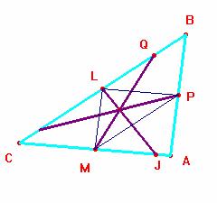 El triángulo mediano (= formado tomando los pies de las medianas de ABC como vértices) es semejante a ABC y de lados paralelos. Si LJ (segmento ruptor) es paralelo a la bisectriz del ángulo en A, como éste es igual al ángulo en L y ambos tienen sus lados paralelos, LJ es la bisectriz de L. Así pues los tres ruptores son las bisectrices del triángulo mediano y concurren en un punto, como se quería demostrar.