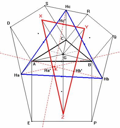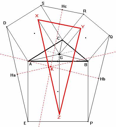 triángulo ABC, y consideramos los vectores Al trasladar según aquellos vectores los triángulos ADE , BPQ y CRS todos concurren en G. Obsérvese que los ángulos en A, B y C de los triángulos primeros miden respectivamente, 180º-A, 180º-B y 180º-C. Luego en G suman 360º. Según esta traslación los puntos Ha, Hb y Hc se transforman en los puntos medios del triángulo XYZ y las mediatrices de los lados no son otras que las mediatrices del triángulo XYZ que concurren en K, circuncentro del mismo. (Prop i) |