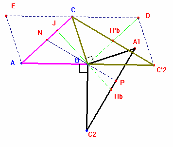 De las propiedades de las diagonales del paralelogramo deducimos que el segmento BH’b es paralelo e igual al segmento AN, y por tanto, que la mediana del triángulo externo BA1C2 es perpendicular al lado AC: es la altura desde B del triángulo ABC.