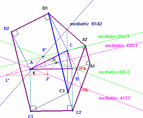 Para hallar la del primer segmento, localizo en K’ el vector CB (que es el que realiza la traslación de A2C3 a A1C2 ), y trazo por su extremo una paralela a la mediatriz de A2C3.