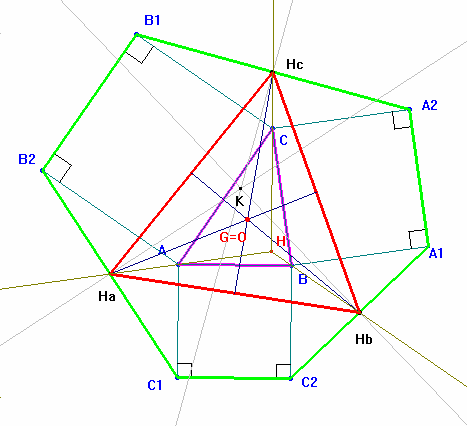 Los vértices A1 A2 B1 B2 C1 C2 de los cuadrados diferentes de los del triángulo ABC forman un hexágono; las mediatrices de sus lados pasan alternativamente por el circuncentro U de ABC y por un segundo punto K.