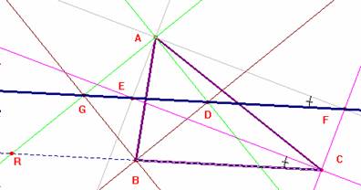 .- Por la construcción quedan determinados los paralelogramos (rectángulos) AFCE y ADBG. En efecto: AF es paralela a EC por ser ambos perpendiculares a la bisectriz exterior de C. AE es paralela a FC por ser ambas perpendiculares a la bisectriz interior de C. El mismo argumento respecto a las bisectrices de B demuestra que también es un paralelogramo rectángulo ADBG.El segmento FE es paralelo a BC pues los ángulos EFA y ECA = BCE son iguales y AF y EC son paralelas. De igual modo resultan paralelas GD y BC ya que los ángulos ADG y GBA=GBR son iguales. Por las propiedades de los paralelogramos, GD corta a AB en su punto medio, y EF a AC en su punto medio; resulta que los puntos E y D , F y G, son puntos de una misma recta: la paralela media, y por tanto yacen todos sobre ella. c.q.d.