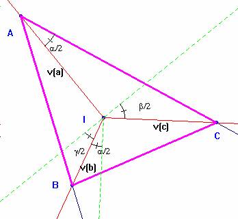 Supongamos el problema resuelto. Un sencillo cálculo nos permite obtener el valor de los ángulos formados desde el incentro: BIC=90+a/2; BIA = 90 + g/2; AIC = 90+ b/2. Restando a estos ángulos un recto, se obtienen los ángulos mitad de los del triángulo buscado.